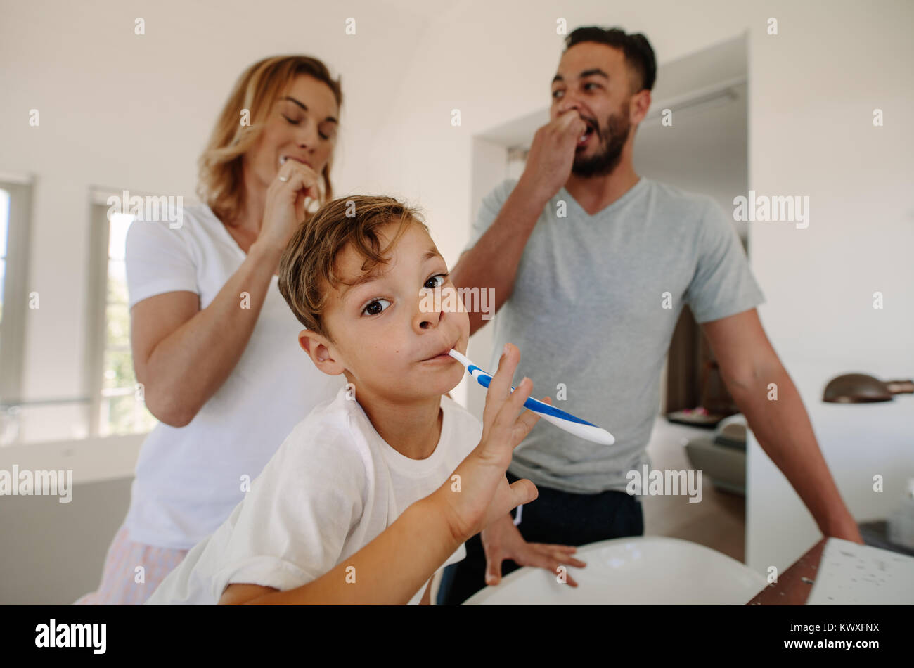 Dem Kind exakt die gleiche Zahnbuerste besorgen die MamaPapa hat. 14012021 - Morgens schnell die Zaehne putzen sich stundenlang vor dem Spiegel schminken eine warme Dusche nehmenUnd natuerlich. Familie zaehneputzen in dass badezimmer Stock Foto - Glow Images RM.